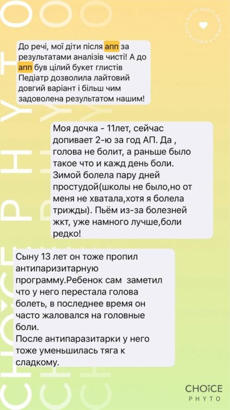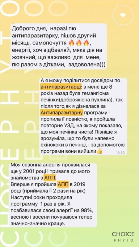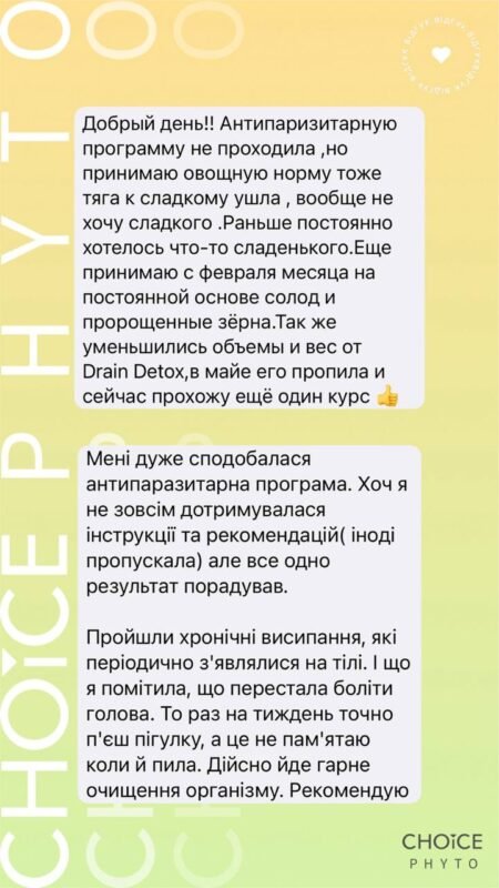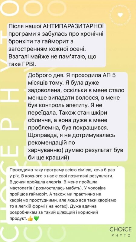 Натуральні антипаразитарні програми CHOICE допомагають м’яко та ефективно вивести паразитів з організму, відновити імунітет, мікрофлору кишечника та роботу печінки, жовчного міхура, підшлункової залози.