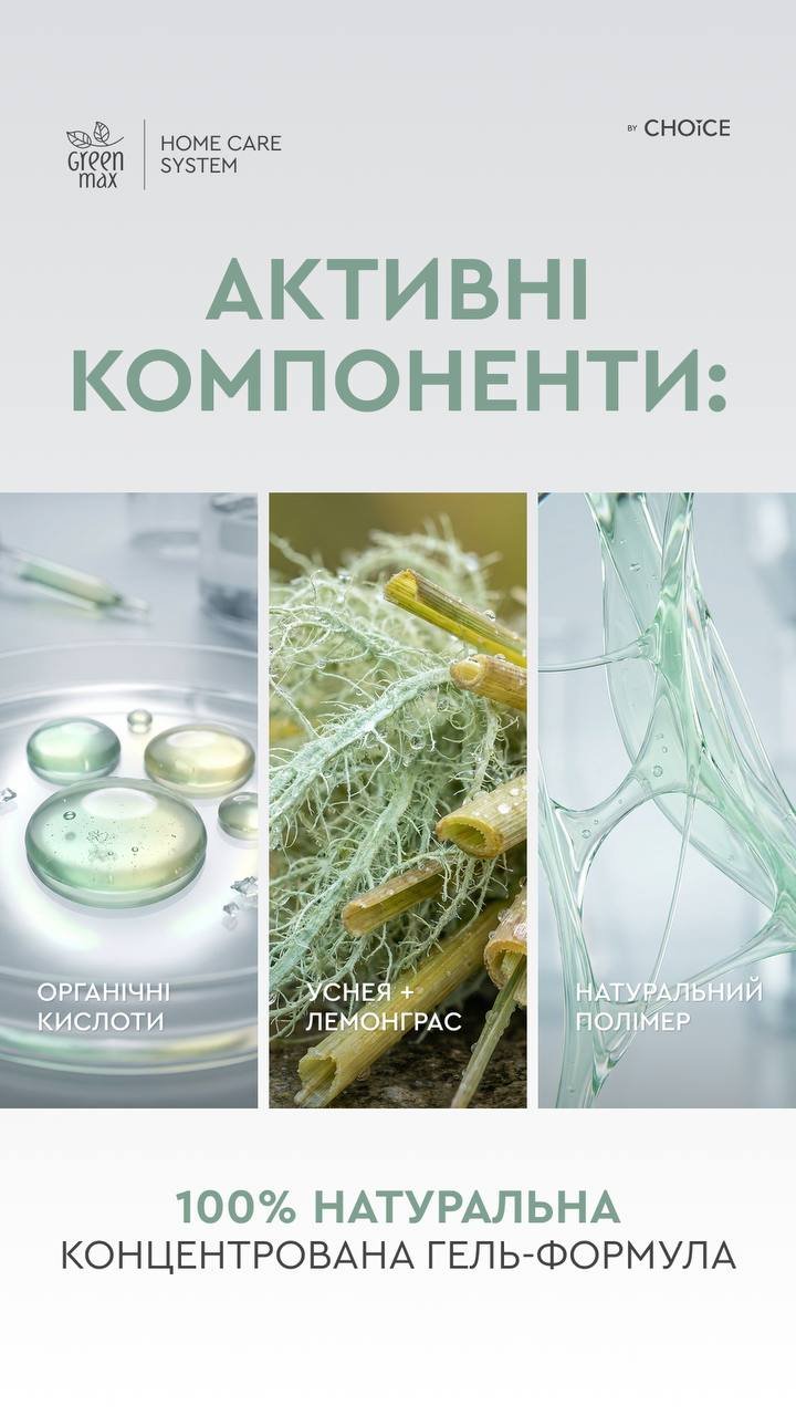 Концентрована гель-формула на основі органічних кислот для безпечного щоденного очищення унітазів. Видаляє забруднення різного походження. Містить натуральний полімер, що полірує поверхню та захищає її від відкладень іржі, сечового каменю та вапняного нальоту. Молочна кислота й комплекс уснеї та лемонграсу здійснюють антибактеріальну дію. Щоденне використання забезпечує гігієнічну чистоту та яскравий блиск. Залишає свіжий м’ятно-цитрусовий аромат. Не містить хлору.