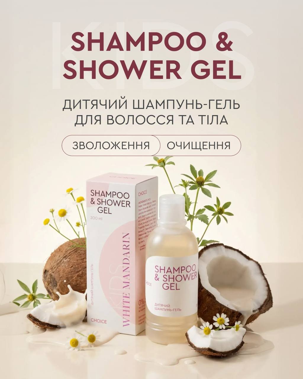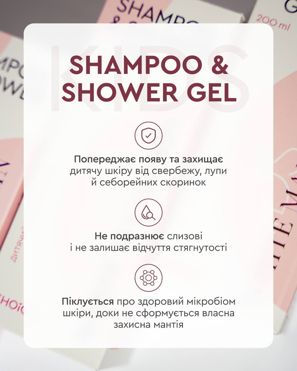 Дитячий шампунь&гель для волосся та шкіри містить активні рослинні компоненти, перед використанням протестувати на невеликій ділянці тіла.