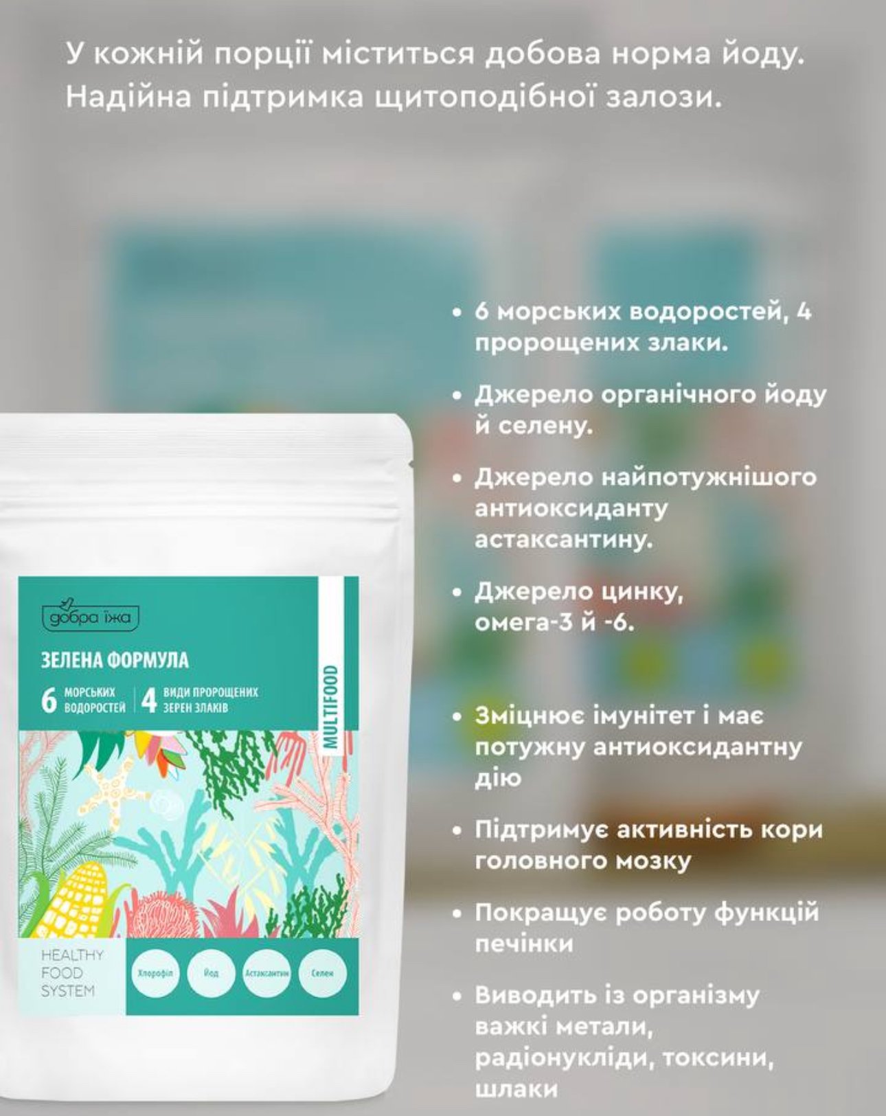 “Зелена формула” збагачена морськими водоростями і пророщеними злаками для здоров’я щитоподібної залози та підтримки імунітету. Містить добову норму йоду.